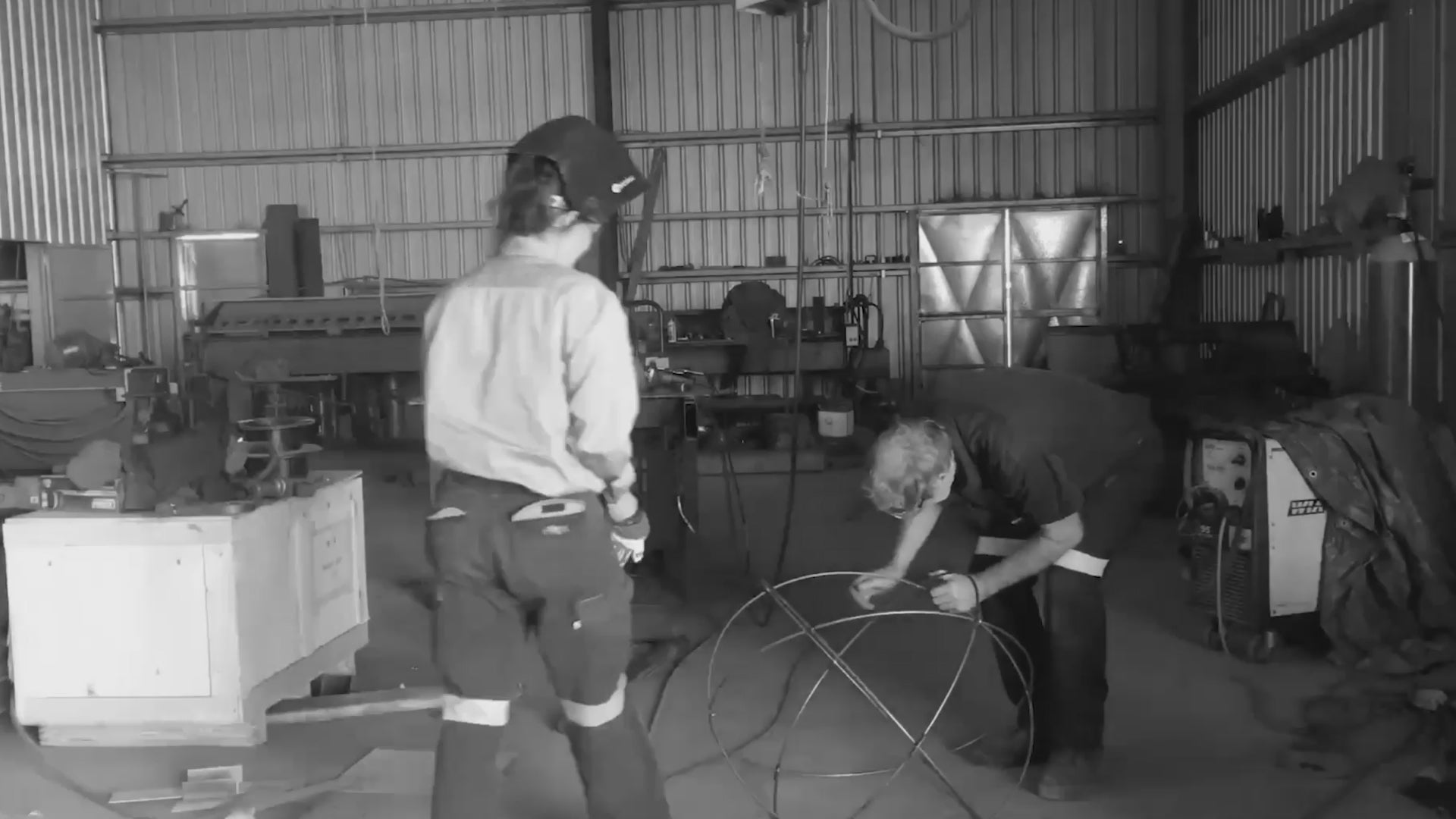 The current phase is Emily making + experimenting with Colin on the geometry and structure of steel spheres in the Western Australian Goldfields workshop.